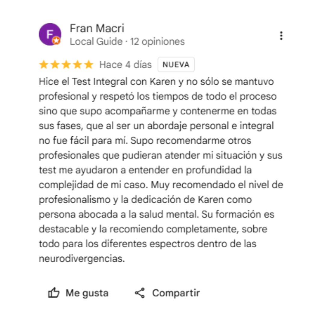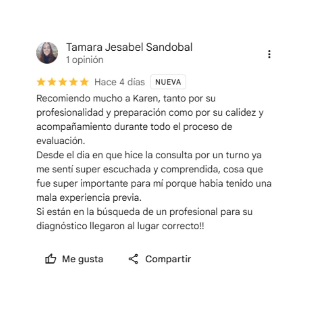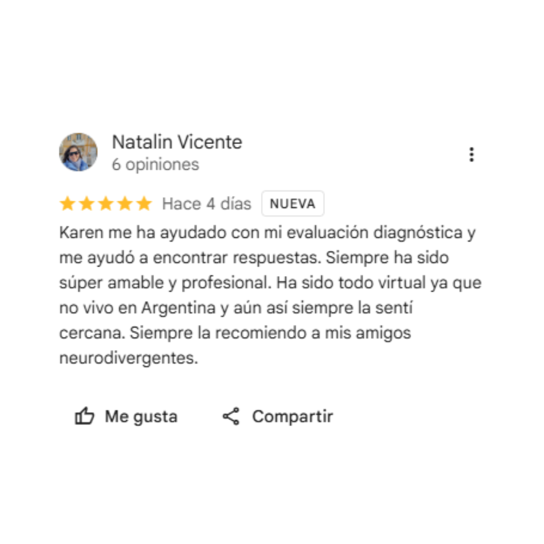 Al evaluar condiciones del neurodesarrollo es sugerible realizar entrevistas con personas del entorno (las mismas se envian por mail). De todos modos podes realizar la evaluación con tu historia de vida.